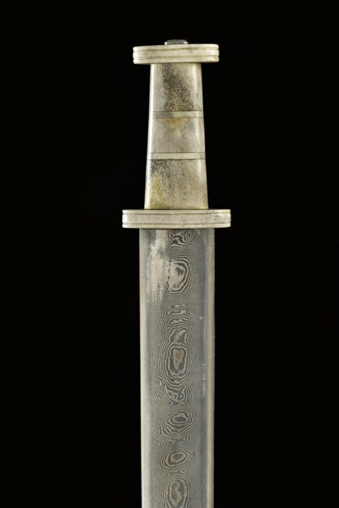 The spatha (Latin ›broad blade‹ ) is a double-edged, parallel-sided cutting sword used by both Romans and Germanic tribes. In the Germanic world it was primarily a rider's weapon, which is also reflected in the short hilt. A low weight of one kilogram enabled the sword to be wielded quickly. The Thuringian sword makers mastered damascening and thus produced hard-elastic blades with partly decorative patterns. A new feature was the cross-guard, which prevented the hand from slipping forward during the thrust. Only wealthy people could afford the corresponding costs for these excellent weapons.