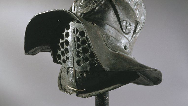 Weiterer Aspekt des pompejanischen Alltags, der wieder aus dem Kosmos des Hauses herausführt, sind die Gladiatorenspiele, die, wie in der römischen Antike allgemein üblich, zur Unterhaltung des Volkes im Amphitheater der Stadt abgehalten wurden. Auf einzigar- tige Weise wird dieser durch einen Komplex prachtvoller, mit aufwendigen Reliefdarstellungen verzierter Helme und Beinschienen aus der Gladiatorenkaserne von Pompeji repräsentiert. Die Waffen verdeutlichen die unterschiedlichen Gladiatorengattungen, die nach festen Regeln in der Arena miteinander kämpften. So trat etwa der Retiarius, ein nur leicht Bewaffneter mit Fischernetz und Dreizack, stets gegen den Secutor an, der mit Schild und Schwert sowie einem Helm mit kleinen Augenöffnungen ausgestattet und daher ungleich schwerfälliger war.